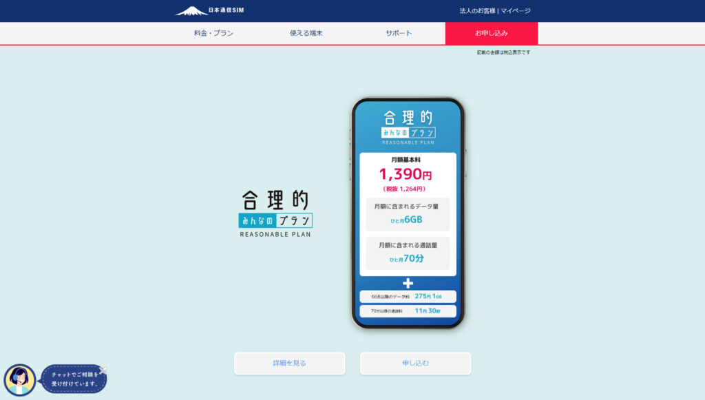 合理的みんなのプランは、月間データ容量 6GB に 70 分の無料通話がついて月額 1,390 円(税込)。