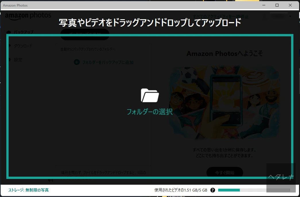 アップロードしたい写真や写真の入ったフォルダを Amazon Photos のウィンドウ上にドラッグすると、アップロード先のフォルダを選択する画面が表示されます。