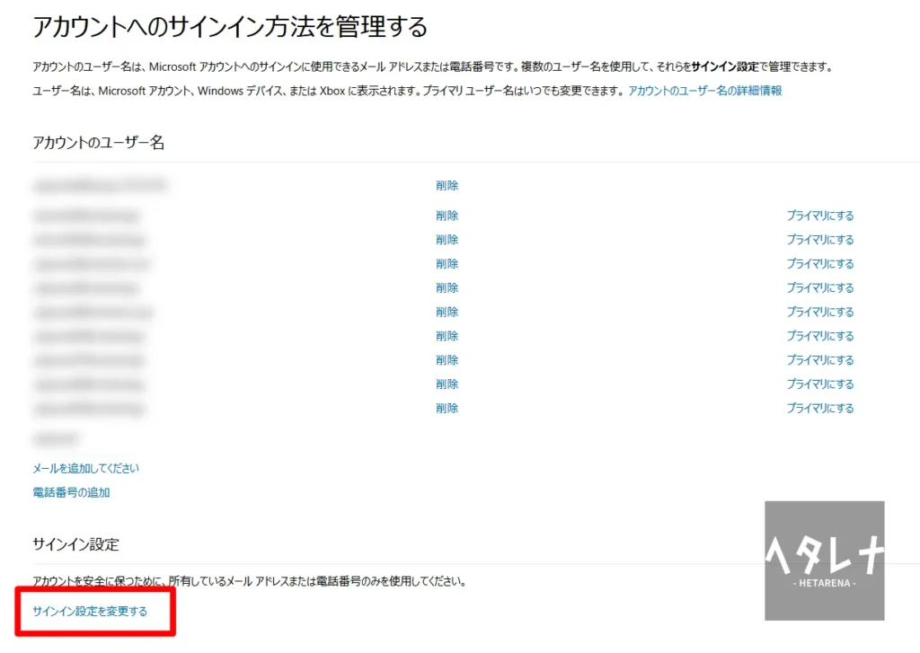 次に「アカウントへのサインイン方法を管理する」ページ下部の「サインイン設定を変更する」のリンクをクリック。