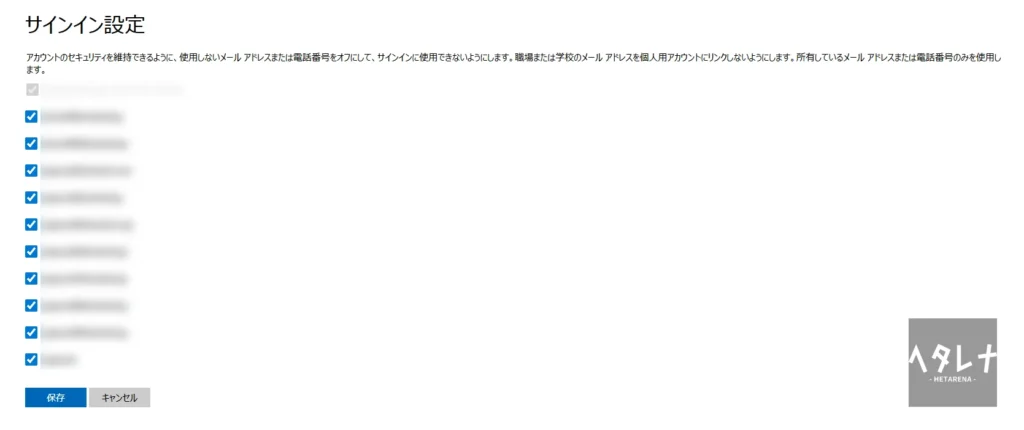 筆者のアカウントはすべてのエイリアスやユーザー名でサインインが可能になっていたため、プライマリ以外のエイリアスやユーザー名は、すべてサインインに使用できないよう設定を解除しました。