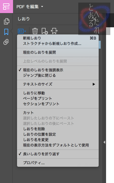 オプションからはしおりの順番を入れ替えたり、しおりの位置を変更したりすることができます。